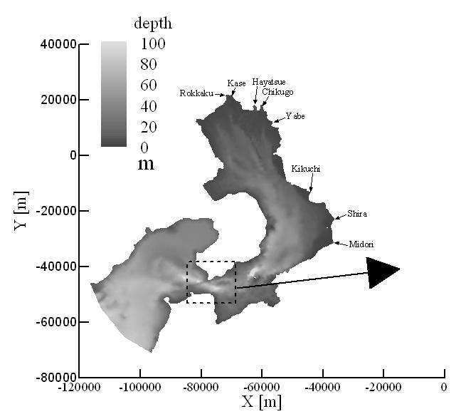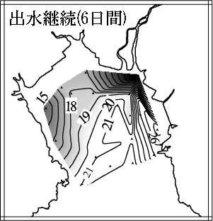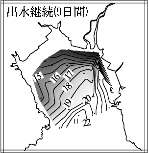 その結果、河川水は有明海奥部に流入後、岸を右に見つつ伝搬していくこと、出水が長期に渡ると徐々に奥部全域に