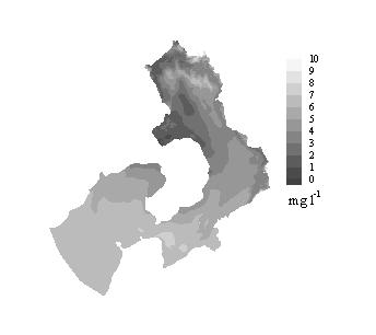 図11:計算された有明海奥部の底層DO濃度分布[mg/l]