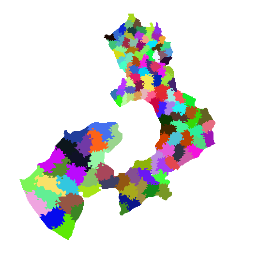 図9:並列計算で用いた領域分割(左:8領域,右:128領域に分割)