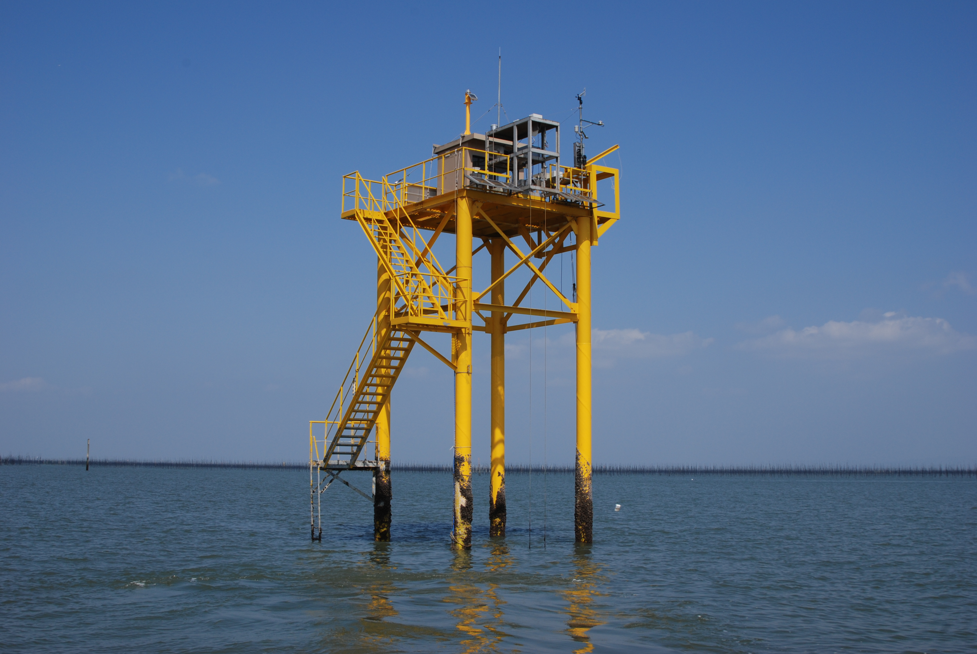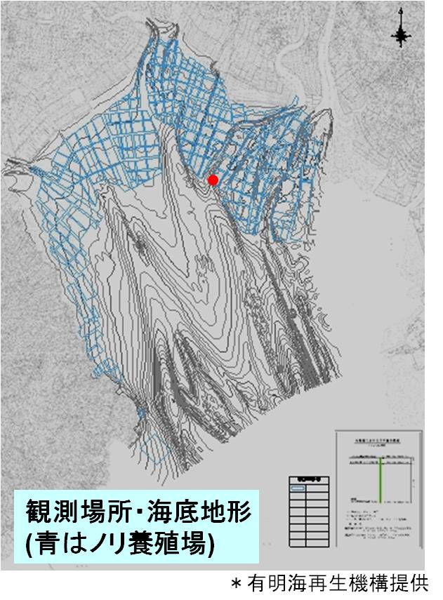 図4:現在のタワー写真およびタワー位置●(コンター線は水深、青い部分はノリ養殖海域)