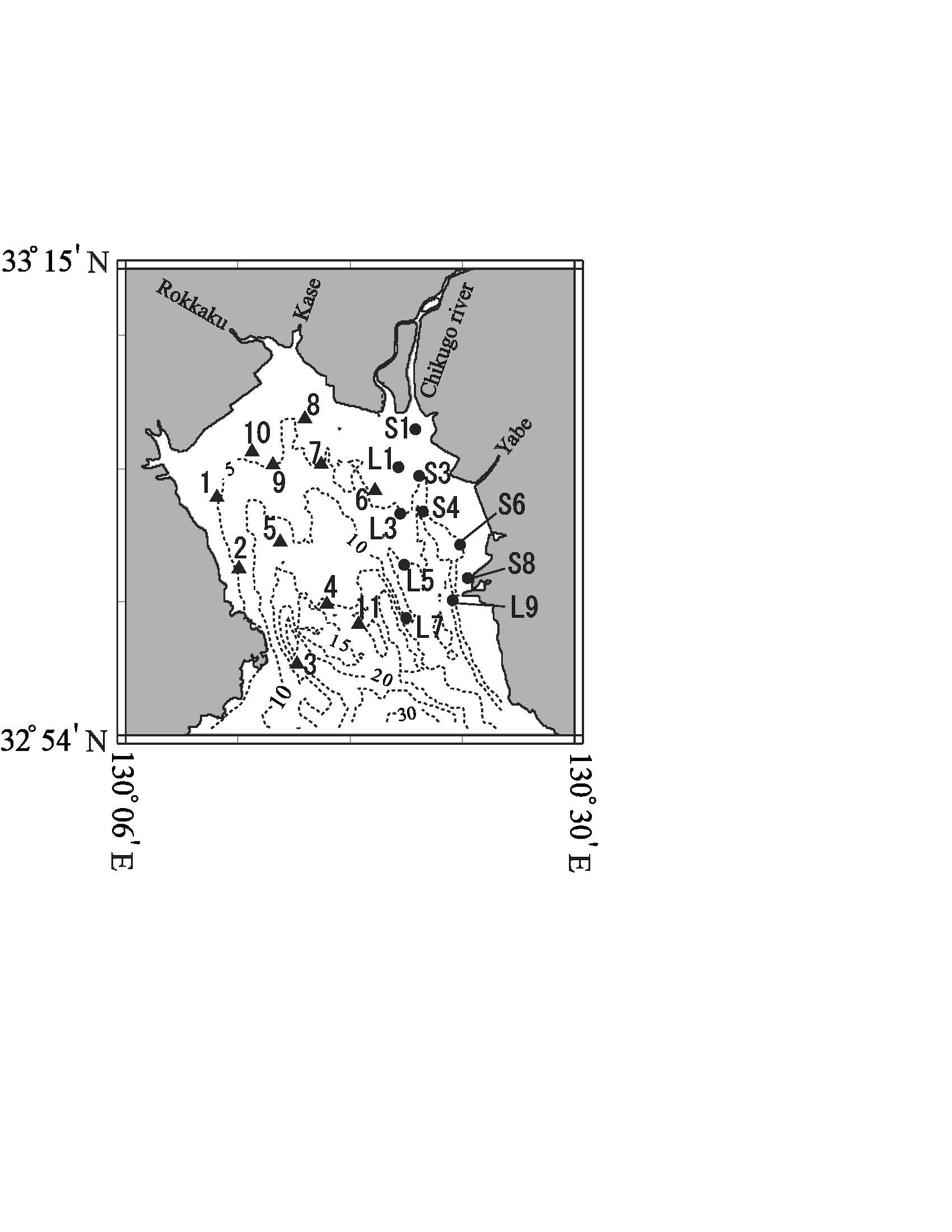 図6:浅海定線調査観測点図(点線は水深)
