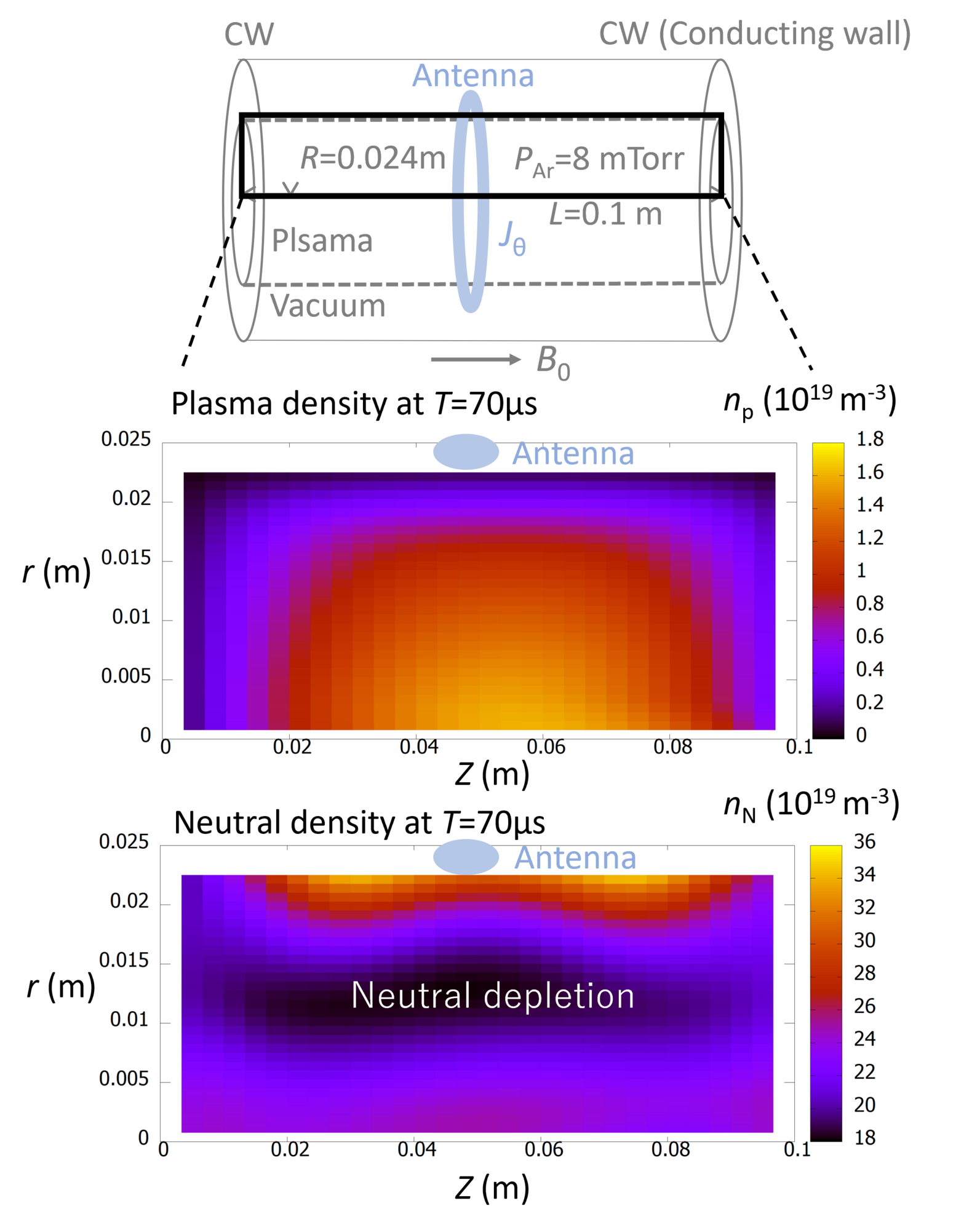 Neutral depletion occurs at 0.005 m<r<0.015 m.