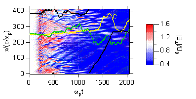 パルサーや活動銀河中心核などの高エネルギー天体周辺では、非常に大振幅の相対論的アルフヴェン波が存在すると考えられています。一般に、波動の振幅が大きくなると、波動-波動相互作用によってさまざまな波長の波が生成されますが、この過程はパラメトリック不安定性と呼ばれます。相対論的アルフヴェン波のパラメトリック不安定性の分散関係は、その難解さのためにこれまできちんと求められていませんでしたが、我々はこれに成功しました。さらに、計算機シミュレーションにより不安定性の長時間発展を調べた結果、アルフヴェン波の初期エネルギーや周波数によってパラメトリック不安定性の種類が変化すること、また、初期エネルギーを大きくすると高エネルギー粒子の生成効率が著しく高まることなどを発見しました。これらの現象には、いずれもプラズマの相対論的効果が重要な役割を果たしており、現在それらを詳しく議論しています。