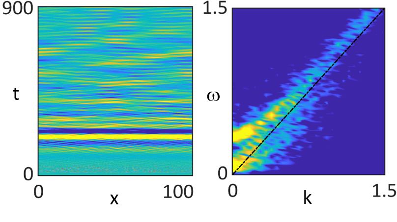 磁場の時間空間発展(左)と周波数-波数スペクトル(右)