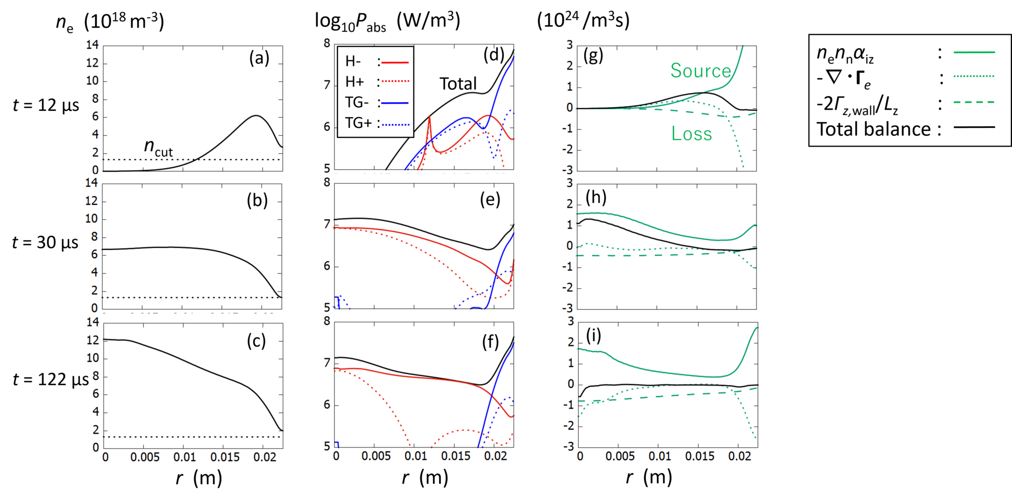 高周波プラズマ生成では入力パワーを上げても密度が飽和してしまいます。この密度限界はイオン化の種となる中性粒子が枯渇することが原因だと考えられており、プラズマ源の更なる高密度化を目指すにあたっては、この中性粒子枯渇過程を解明する必要があります。現在は中性流体の運動を含むシミュレーションにより中性粒子枯渇過程の時空間発展の解析を進めています。